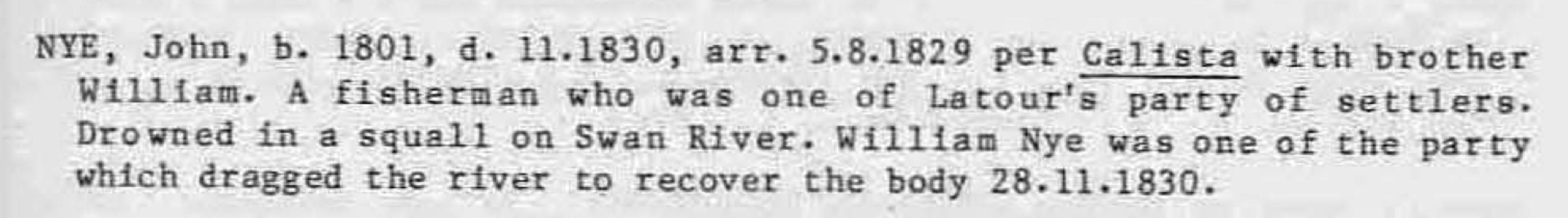 Six months after the initial boats landed at the Swan River Colony, after a four-month sea voyage from England, John Nye (born 1801) and his brother William (born 1787) from West Sussex, arrived on the Callista on 5 August 1829. Also aboard was Alexander Forbes (born 1809). John and Alexander were the first commercial fishermen of the Swan River Colony.