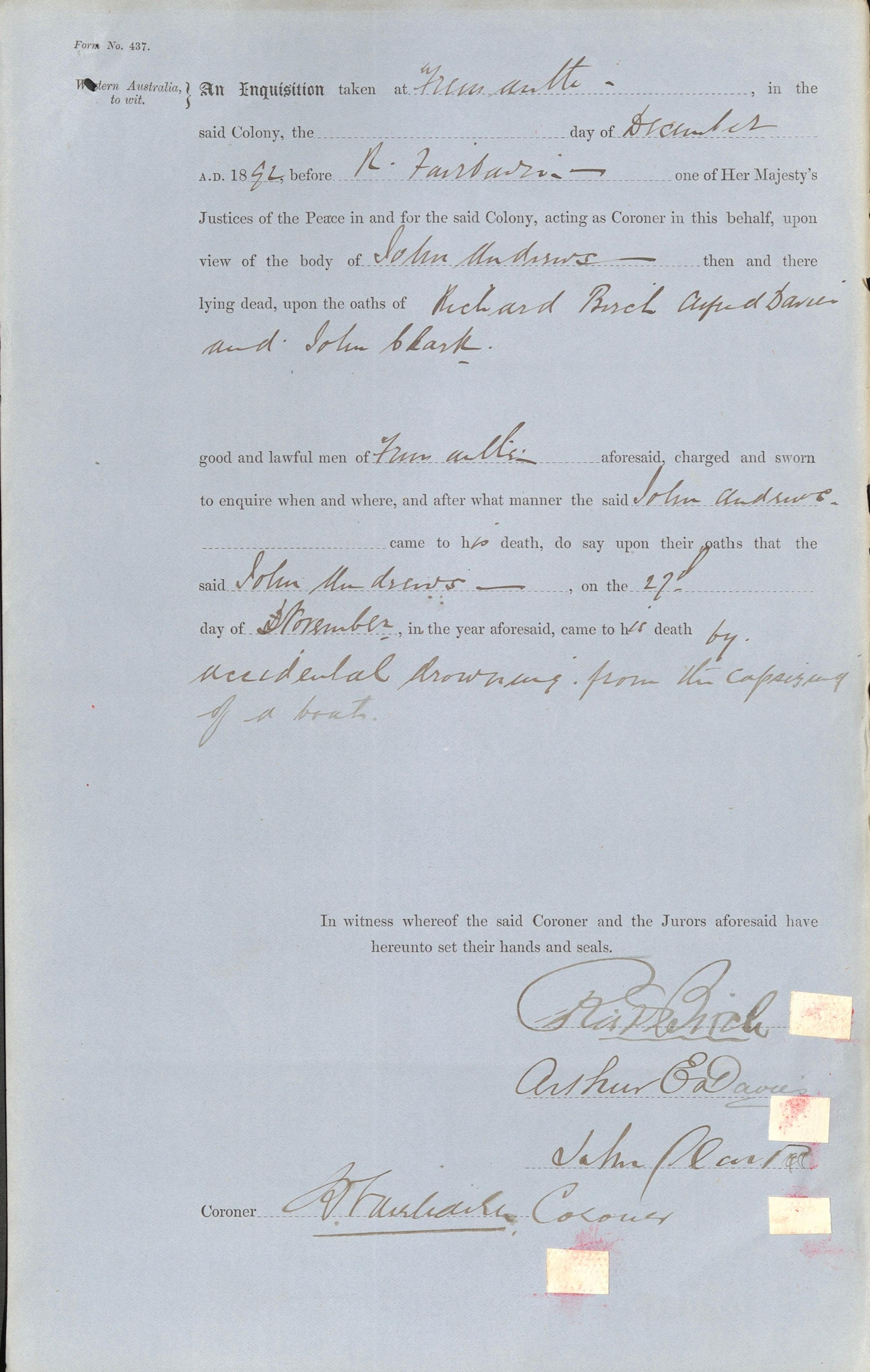 Meeting the other boat gave William the opportunity to jump on board and sail back to Fremantle. William later gave a detailed account to the Coroner’s court, which included the fact that there was no liquor on board, and that all three men were sober at the time of his departure.