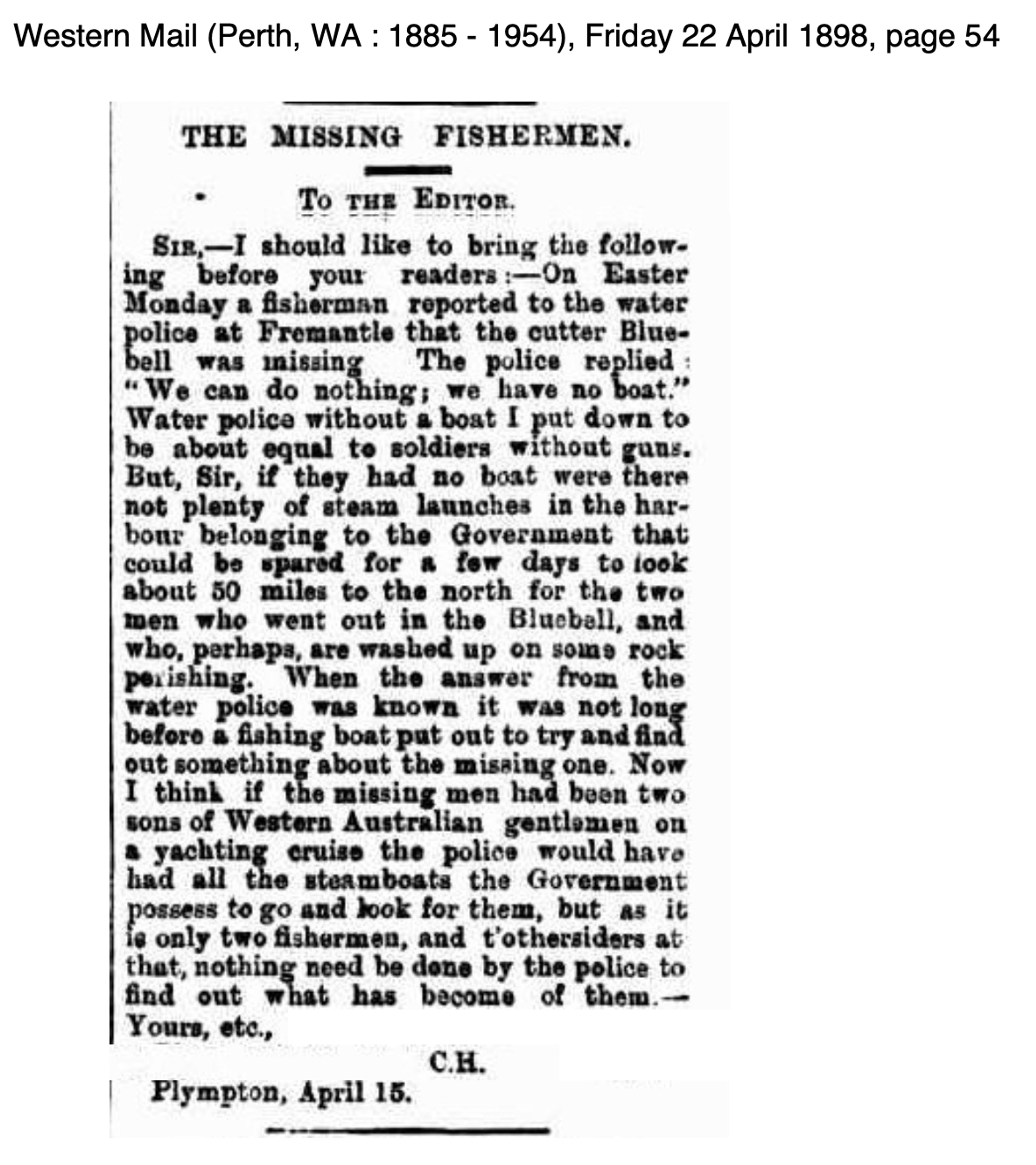 Now as the public have to contribute towards their upkeep, whether they return a penny to the revenue or not, why was not one or more of these State lay-at-anchor or hitched-to-the-quay luxuries despatched with as much expedition as possible on the humane and legitimate errand of determining, if possible, the whereabouts of the missing boat and men – a class of work for which most of them are particularly well adapted?...I think if the missing men had been two sons of Western Australian gentlemen on a yachting cruise, the police would have had all the steamboats the Government possess to go and look for them, but as it is only two fishermen and t’othersiders at that, nothing need be done by the police to find out what has become of them…So far as I am aware this is the first occasion on record in this colony that a cry from those in need of help has not been responded to by the Government, and it is to be hoped that in the name of all that is noblest and best in human nature, it will be the last (West Australian, 26 April 1898: 3b).