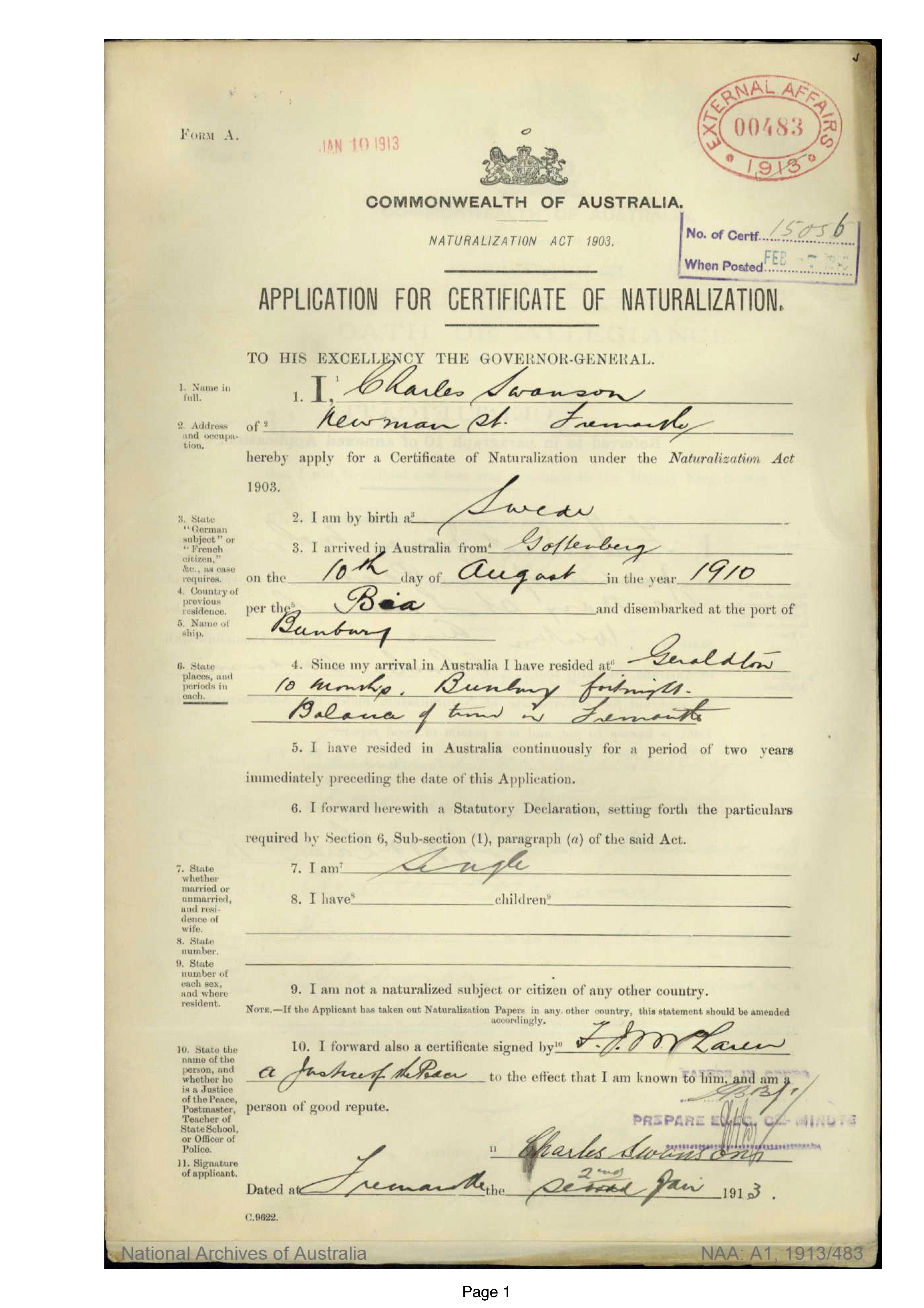 Charles Swanson Naturalisation Certificate