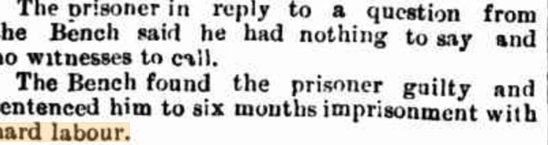 In February 1890 John Callaghan of Geraldton was sentenced to six months imprisonment with hard labour for petty larceny. He was hard up. He had lost his job as the hostler at Trigg’s Freemasons Hotel and had no income to support his wife.