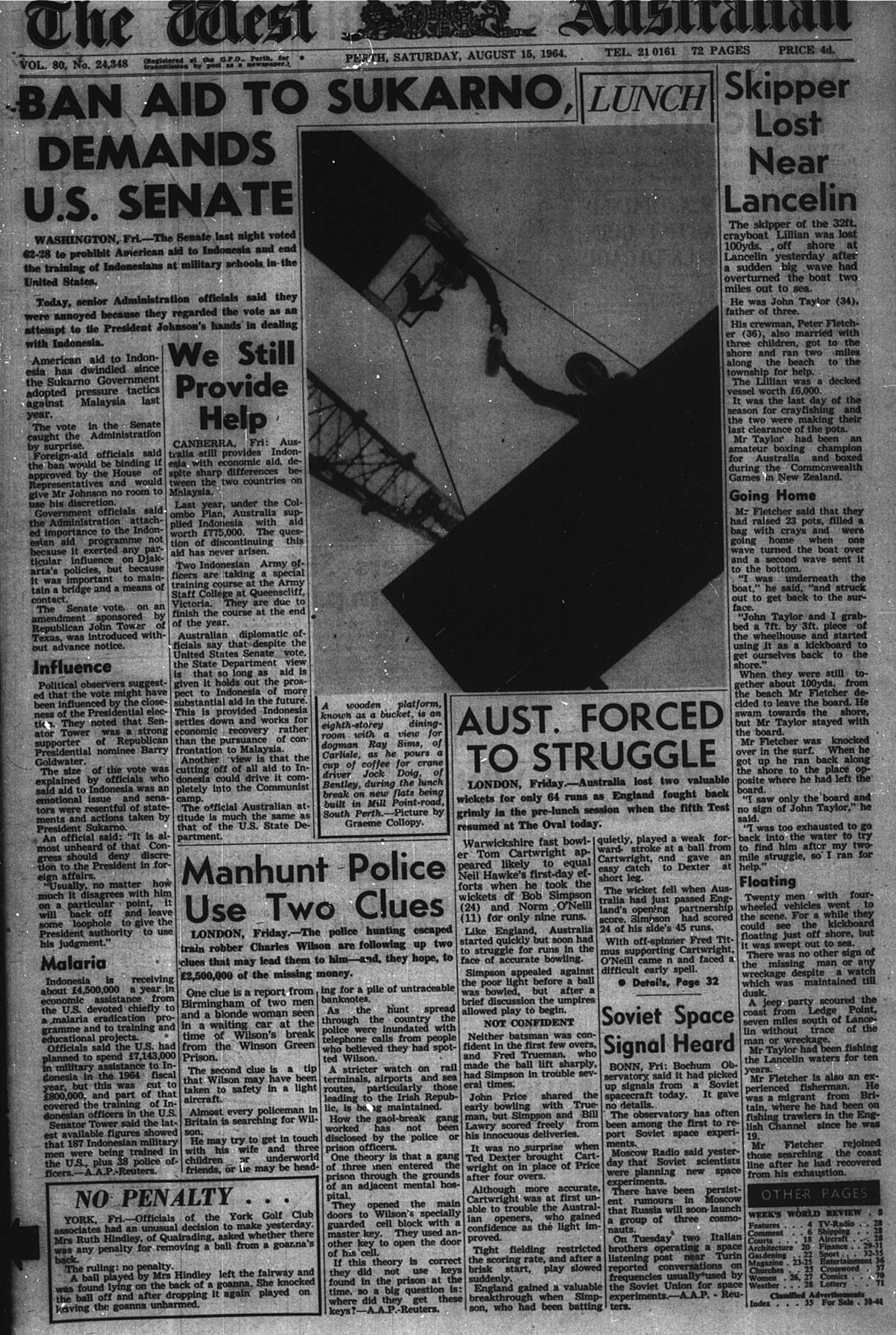 ‘Skipper lost near Lancelin’ was a front page headline in the West Australian on Saturday, 15 August 1964.
