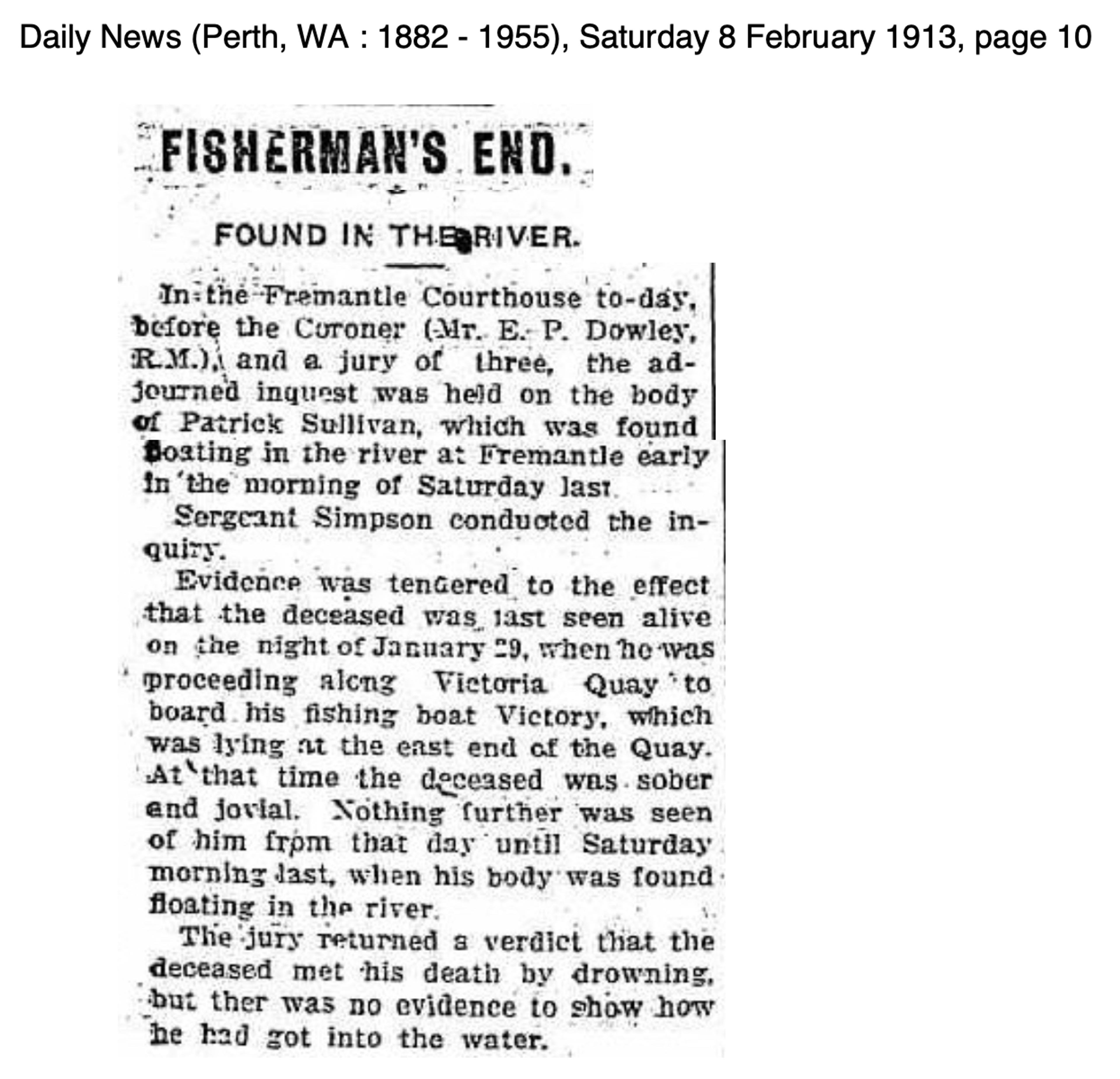 Sullivan had “for years been following the occupation of a fisherman” and had just returned from a successful fishing cruise. He had left his home at 6pm on the afternoon of 28 January and was last seen alive at 11:30pm, standing on the wharf almost opposite where later his body was recovered.