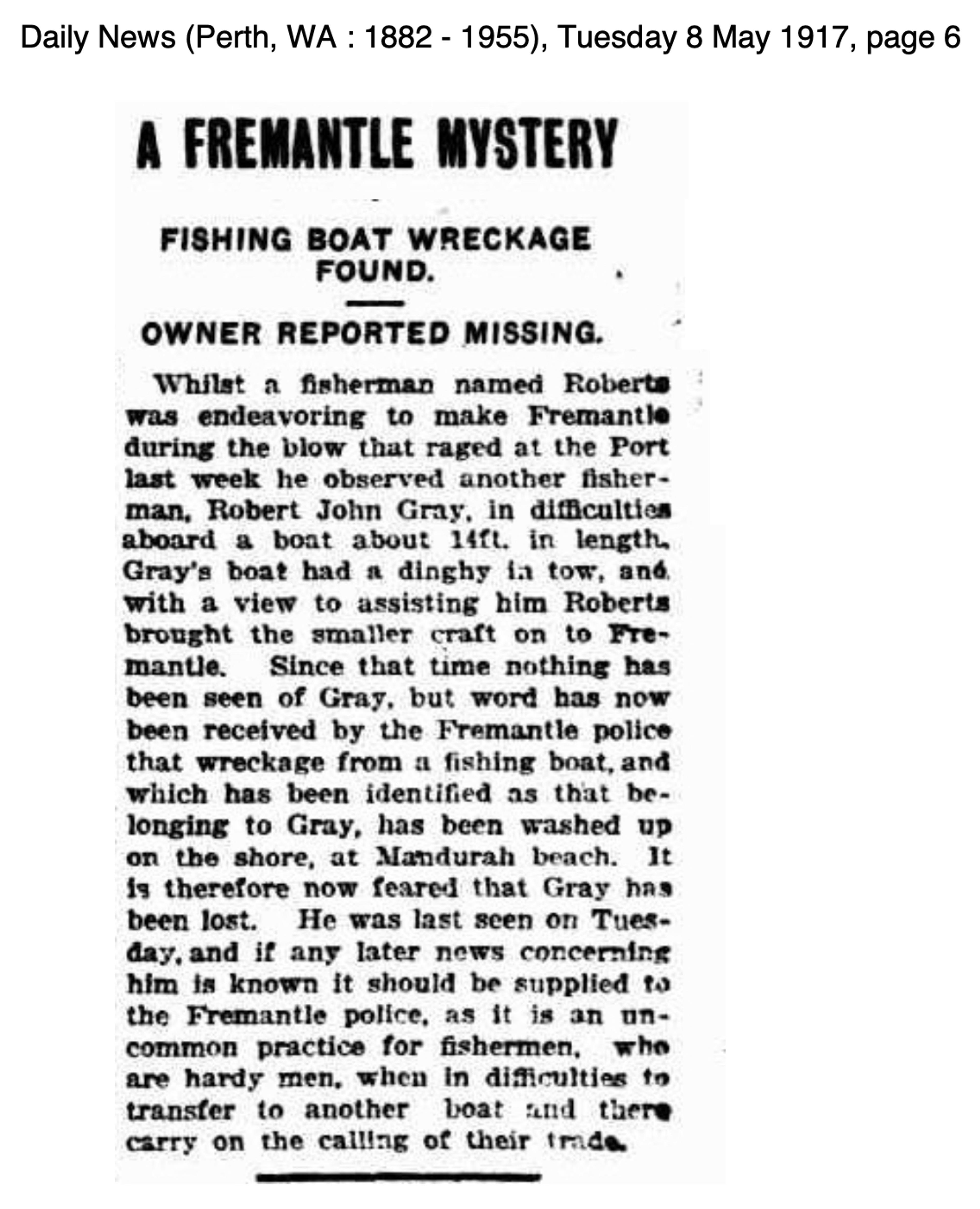 A week or so later, some wreckage and several fish baskets and other objects, which had been in Gray’s boat, were later found on the beach south of Mandurah.