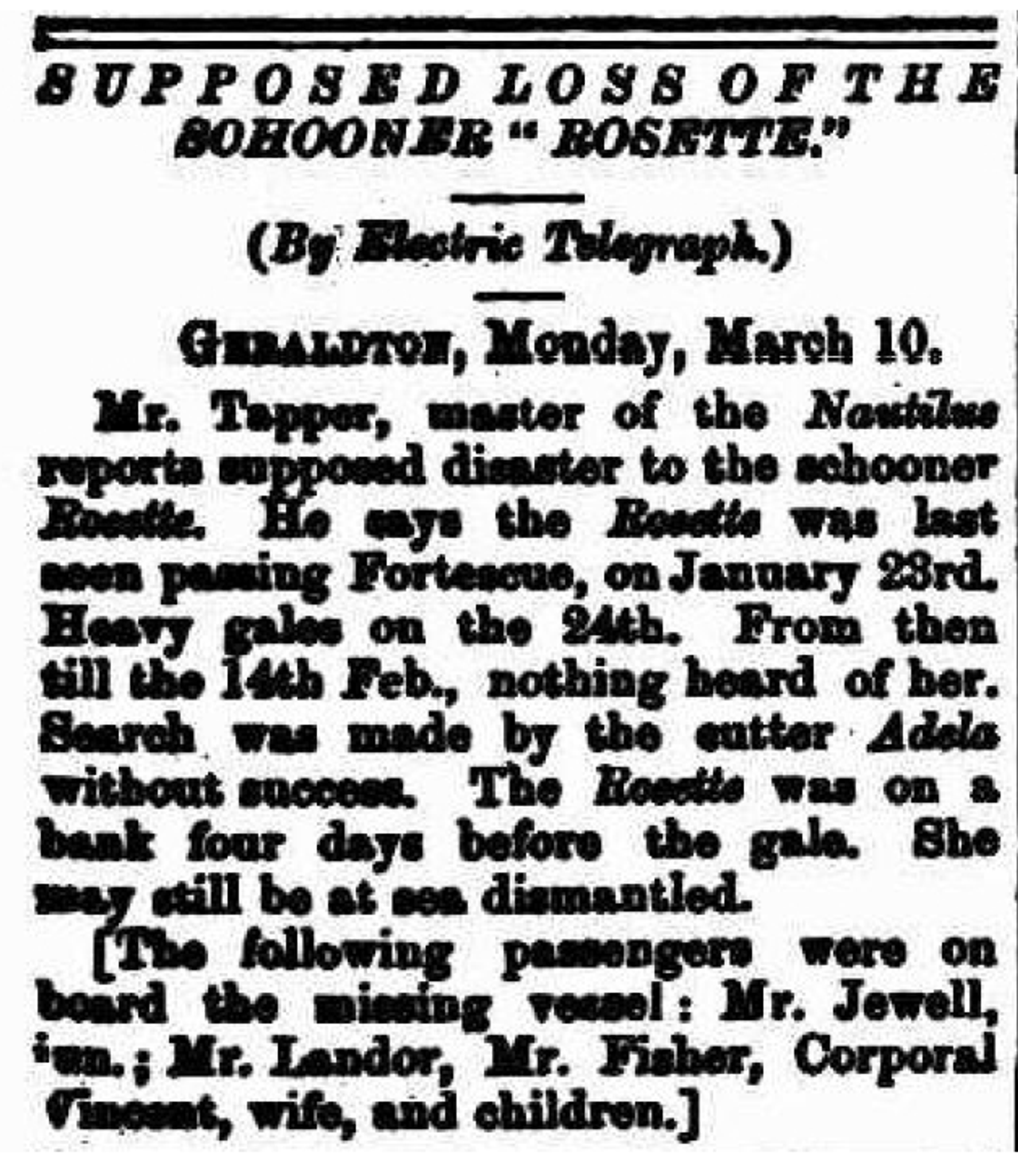 On 11 February Sergeant Vincent reported there was no trace of the Rosette, and there were no reports of sightings. Then, on 17 March word came from Master Kelly on the schooner Kate at Cossack. He had left Port Walcott sailing south, and he found Rosette, sunk at her anchors near Rosemary Island.