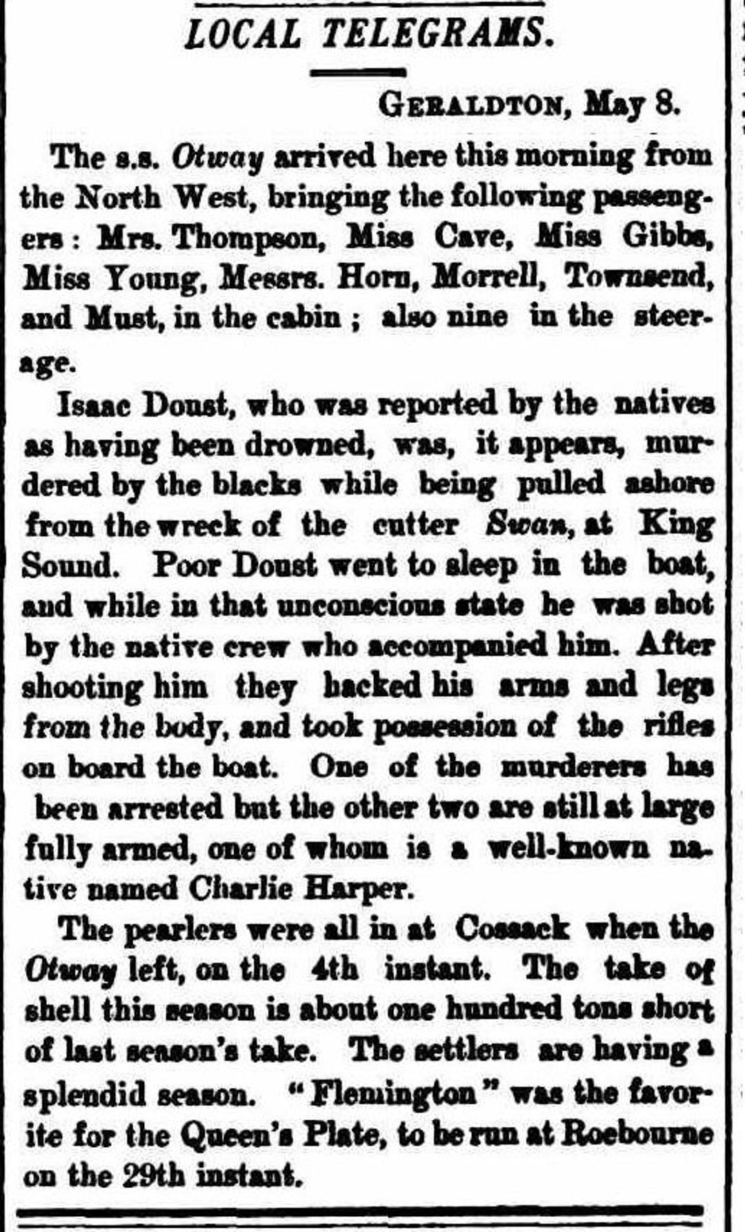 Three crew landed in a dinghy near Broome. They were Charley Harper, Sugary and Tommy. They were armed with rifles. A local Aboriginal man found a gun near the dinghy and he reported that Charley Harper, known in the area, had killed Isaac when he was asleep in the dinghy.