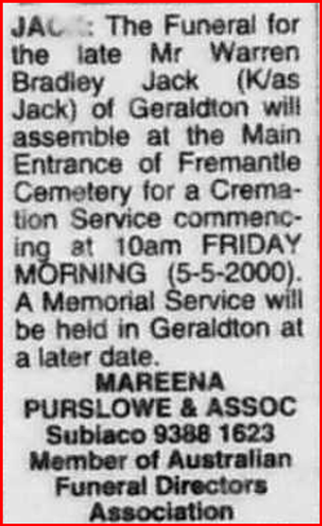 Warren Bradley Jack, known as “Jack”, was born in Geraldton on 10 November 1970. His parents seem to have moved to Kenwick, and according to the electoral rolls, they resided in the 70s and 80s. Eventually they separated. Jack had a sister and a half-sister.
