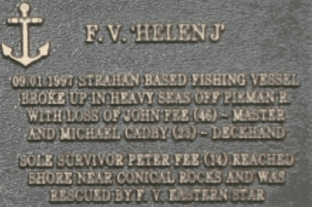 This plaque commemorates the crew of the fishing vessel Helen J. which worked out of Strahan, on the west coast of Tasmania. The Helen J went out to work on 9 January 1997. She left Granville Harbour and was wrecked on a reef off Conical Rocks near Pieman River. Sadly, the Eastern Star that rescued John's son, was lost with her crew six months after the Helen J was wrecked.